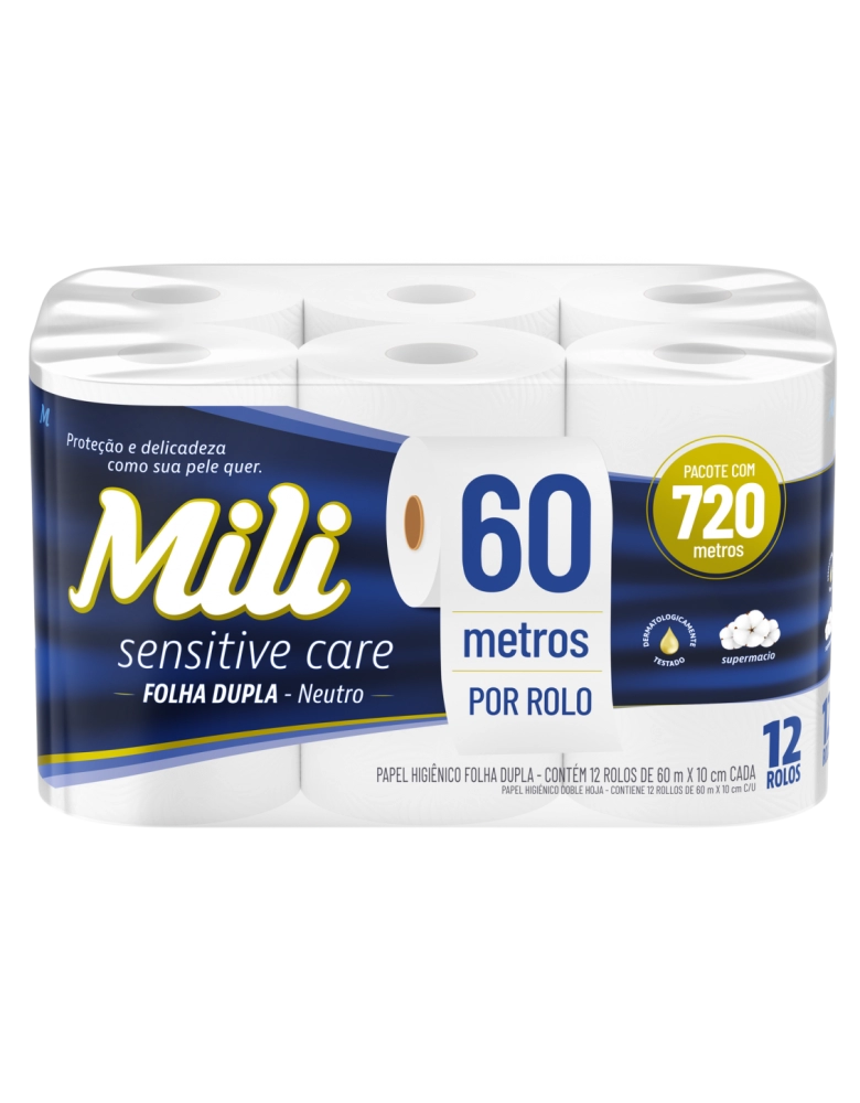 Higiene e Beleza>Higiene Pessoal >Papéis Higiênicos>Mili Sensitive Care Papel Higiênico Folha Dupla Neutro 60m 12 Rolos