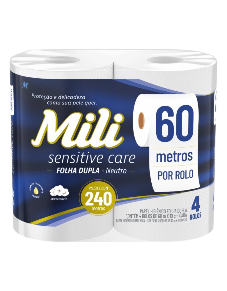 Higiene e Beleza>Higiene Pessoal >Papéis Higiênicos>Mili Sensitive Care Papel Higiênico Folha Dupla Neutro 60m 4 Rolos