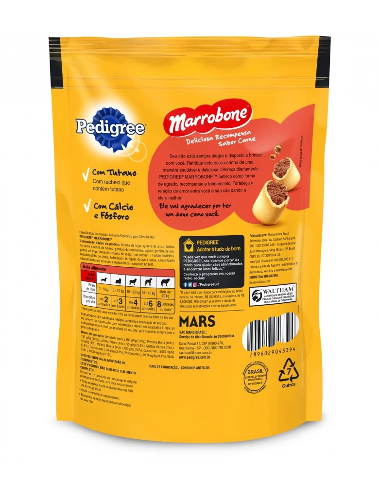 Farinha de trigo, quirera de arroz, Farinha de trigo, quirera de arroz, farinha de carne e osso, gordura bovina, açucar, gordura de frango, glúten de trigo, minerais(cloreto de sódio - sal comum - fosfato bicálcico), metabissulfito de sódio,hidrolisado de fígado de ave e suíno emulsificante (diacetil tartarato de mono e diglicerideos), corante caramelo,BHT.
