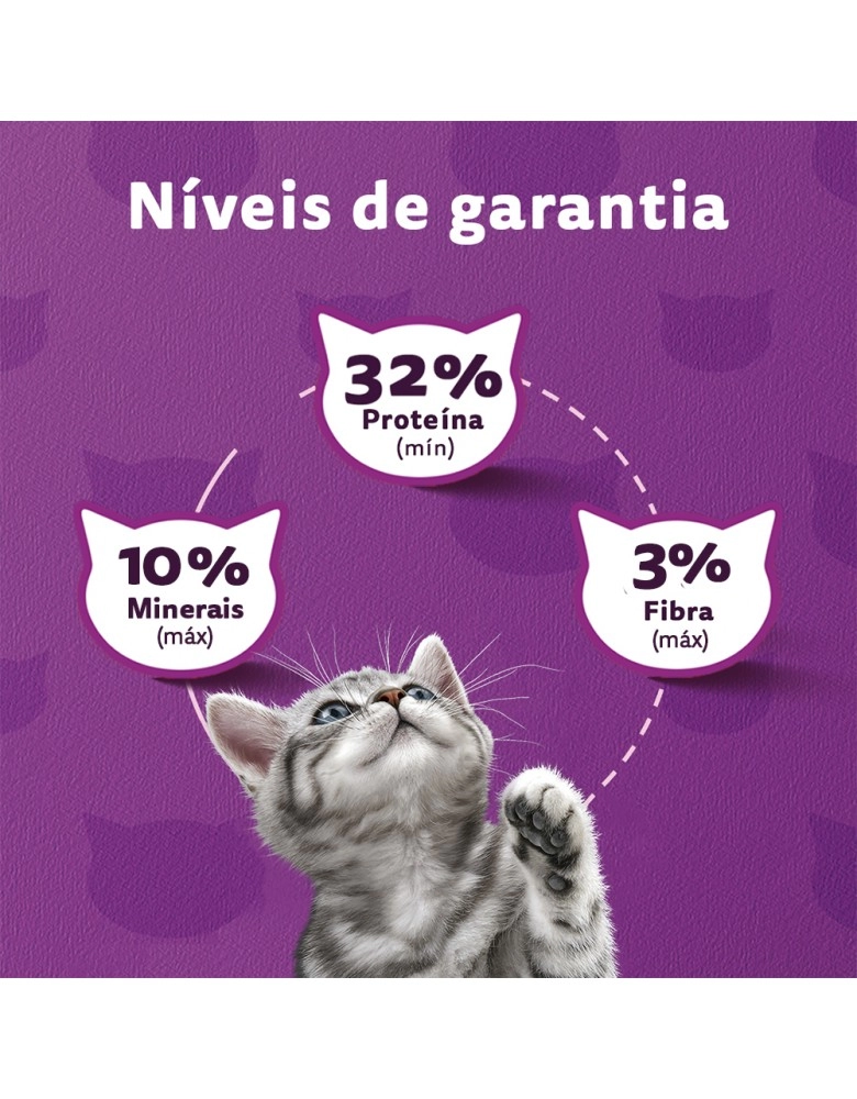 Farinha de Subprodutos de Frango, Glúten de Milho*, Glúten de Trigo, Quirera de Arroz, Milho Integral Moído*, Farinha de Soja**, Gordura de Frango, Gordura Bovina, Óleo de peixe, Leite em pó, Farinha de Trigo, Cenoura, Espinafre, Taurina, Metionina, Hidrolisado de Fígado de Frango, Vitaminas (A, B1, B2, B6, B12, D3, E, K3, Ácido Fólico, Niacina, Biotina, Cloreto de Colina, Ácido Pantotênico), Minerais (Cloreto de Potássio , Cloreto de Sódio – sal comum –, Iodato de Cálcio, Óxido de Zinco, Selenito de Sódio, Sulfato de Cobre, Sulfato de Manganês), B.H.T. (Hidróxido de Tolueno Butilado), Corantes (Corante Natural Caramelo, Artificial Amarelo Crepúsculo, Artificial Amarelo Tartrazina e Artificial Azul Indigotina). Eventuais substitutivos: Farinha de peixe, Farinha de Alga, Farinha de Carne e Ossos, Sorgo em Grão, Proteína Concentrada de Soja**, Cevada em grão. *Espécies doadoras do gene: Agrobacterium tumefaciens, Bacillus thuringiensis, Streptomyces viridochromogenes, Zea mays, Sphingobium herbicidorovans, Dicossoma sp., Diabrotica firgifera, Thermoccocales spp, Bacillus substilis. **Espécies doadoras do gene: Agrobacterium tumefaciens, Bacillus thuringiensis, Streptomyces viridochromogenes, Arabidopsis thaliana, Delftia acidovorans, Pseudomonas fluorescens, Zea mays, Stenotrophomonas maltophilia, B.T. var Azawai e Kurstaqui, Agrobacterium sp.